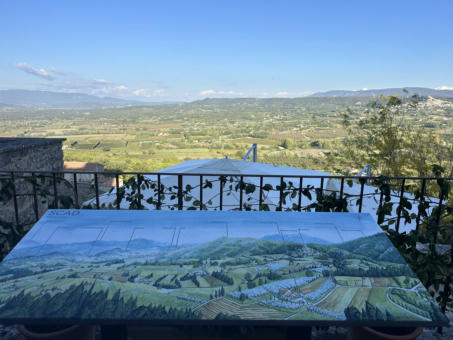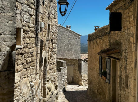 LACOSTEVery small, pretty village on a hillside with a large castle. Slightly mysterious village as the castle belonged to the Marquis de Sade writing his books here, and in modern times to Pierre Cardin.Very mediaval streets and houses, and magnificent views. Café de France invites with a wonderful view for a rest on its terrace. Click here to get a map.