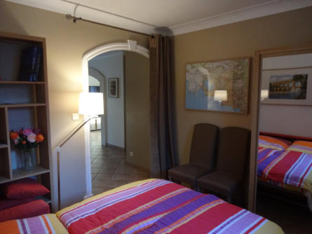LIBRARYThe library provides a nice place of tranquility to read and study about the area,, and provide your tours out.Or just to calm down after a long tour of sightseeing, perusing the literature you have just bought, or which you find on the bookshelf.Or look at the pictures you have taken during the day…Besides being such a welcoming spot, it also provides the opportunity to be turned into a bedroom on a very comfortable, queen-size convertible couch. Ideal as an extra bedroom, but even more ideal for little kids as it does not provide amenities, therefore no chance for the kids to create a big wet mess, or other unwanted surprises for the parents!