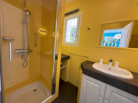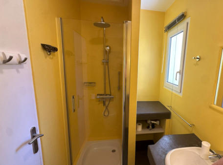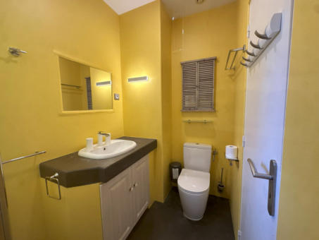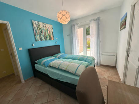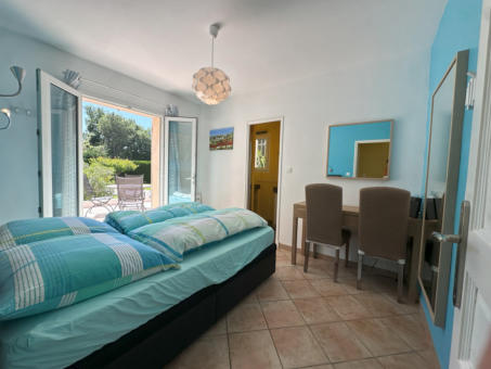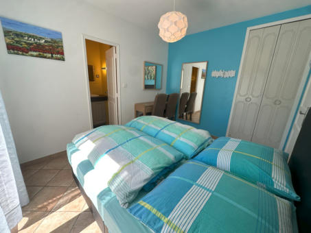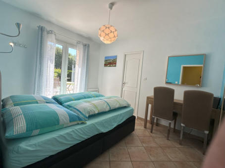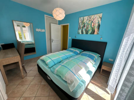BEDROOM 2This bedroom is next door to the main bedroom. A large, comfortable and modern double bed with one single matrace provides you with comfort for one or two, giving you the opportunity to rest and relax … This room comes with its own terrace; ideal to read a book, or have a glas of wine or fresh juice in the evening sunshine. But, of course, at all other times of the day, too.The large wadrobe is french style (in the wall), providing space for your clothes an luggage. A dressing table with mirror supports your needs for preparing yourself for the day, or the evening out.En-suite bathroom with rain shower, sink and toilet provide for the privacy and convenience you look for in such a holiday.