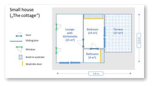 Separate house 50m² with bedroom, lounge, fully equipped kitchen, en-suite bathroom, own terrace (2 people)