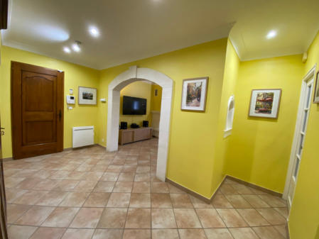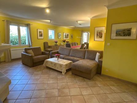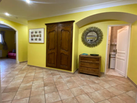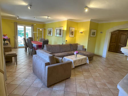 LOUNGEModern ambience in a traditional provencal environment – the design of the house extends into its interior. All furniture is made from french oak in modern french design. Together with the original artworks of local painter Pascal Maucourant this greets your eyes and hearts, providing the pleasure and ambience you deserve!A comfortable couch with integrated “chaise-longue” and a large arm chair invite to relax, talk, have a drink, or enjoy TV, a movie, or just listen to music. In winter the chimney provides warmth and adds to the cosiness … with wood from our own forest ;-)If extra space is needed, couch and arm chair surprise you with having a convertible bed inside!