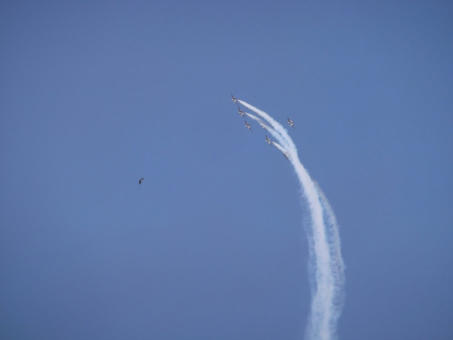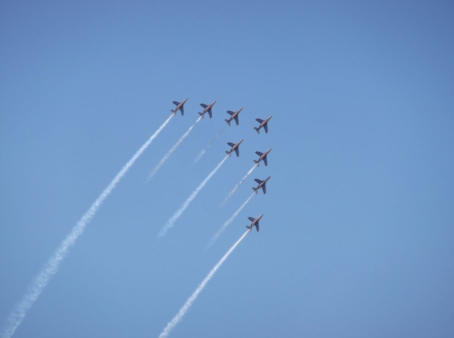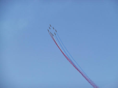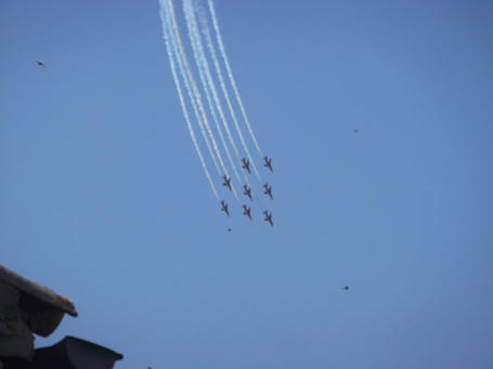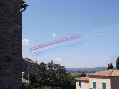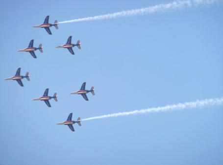 PATROUILLE DE FRANCE Occasionally you might feel disturbed by some jets flying over our area. Take the time to spot them, as what you will see is the elite flight corps of France. 9 Pilots use the area for exercises and show preparations. Their practice time is limited to two time slots, one being from 11-12 on weekdays. They are stationed at the military airbase in Salon.