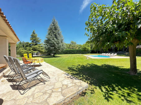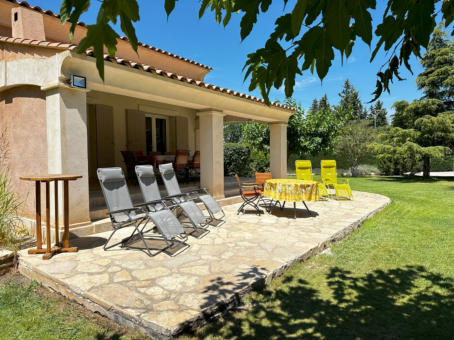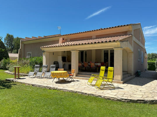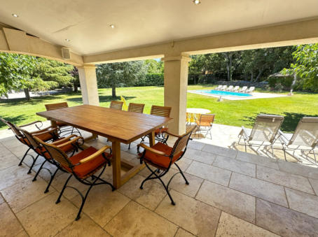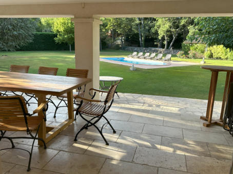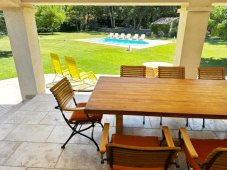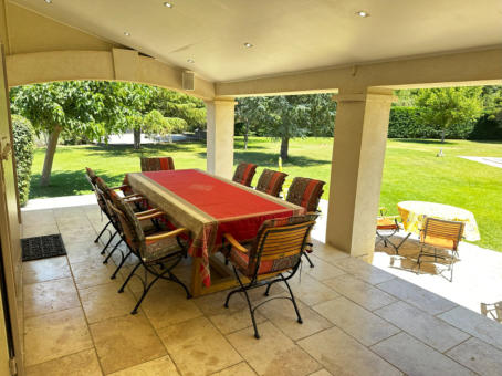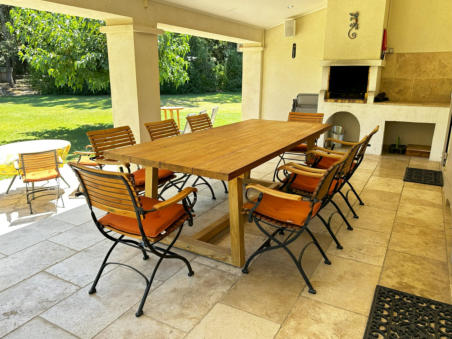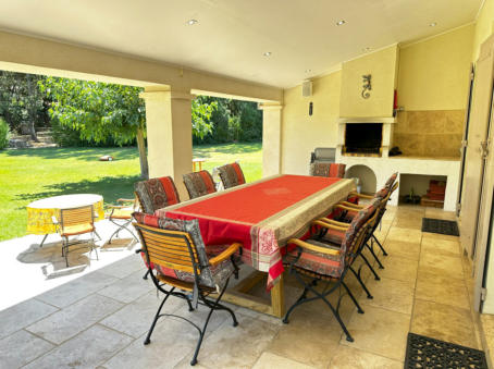 THE VERANDAOne of the most enjoyful things in a provencal house is the veranda and its terrace: Place to have all meals in a day, place to relax and recover, spot to enjoy a fine glas of wine, and the beauty of the garden - All that in a shaded but still pleasantly warm ambience.Of course it extends seamlessly as terrace into the garden – and whenever you feel like it, have your sessions outside in the sunshine, or just under blue sky in the later afternoon and evenings.The kitchen is nearby for refreshing drinks and food. And a built-in barbecue provides for a nice grilling evening, with charcoal, or even firewood collected in the own park, giving your barbecue this unmissable scent of southern trees!